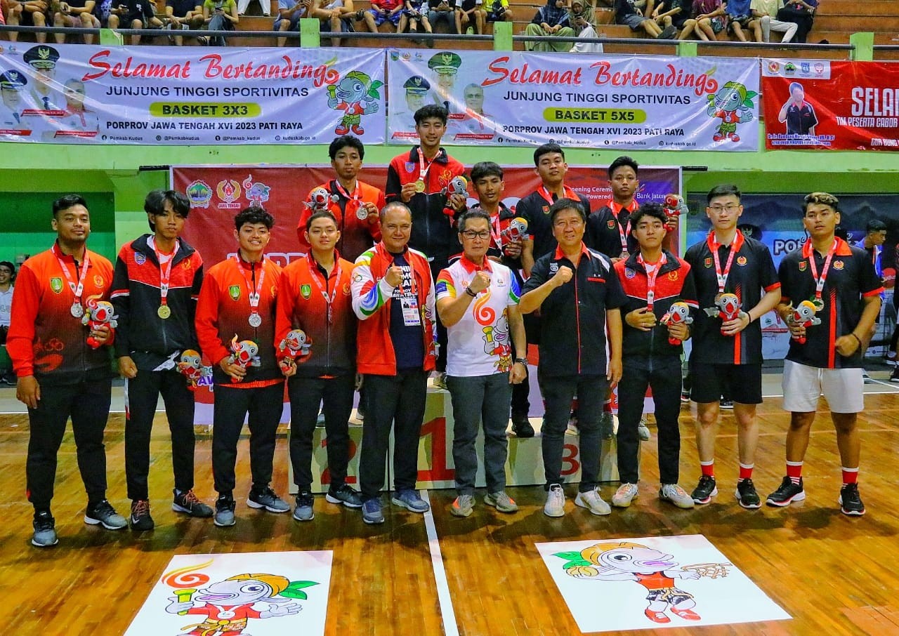 Usai membuka Cabang Olahraga Basket 5×5, Bupati Kudus bersama Ketua Pengprov Perbasi Jateng dan Ketua Harian KONI Jateng menyerahkan medali bagi peraih juara pertama, kedua, dan ketiga cabor Basket 3×3 yang telah dilaksanakan. (put/rls)
