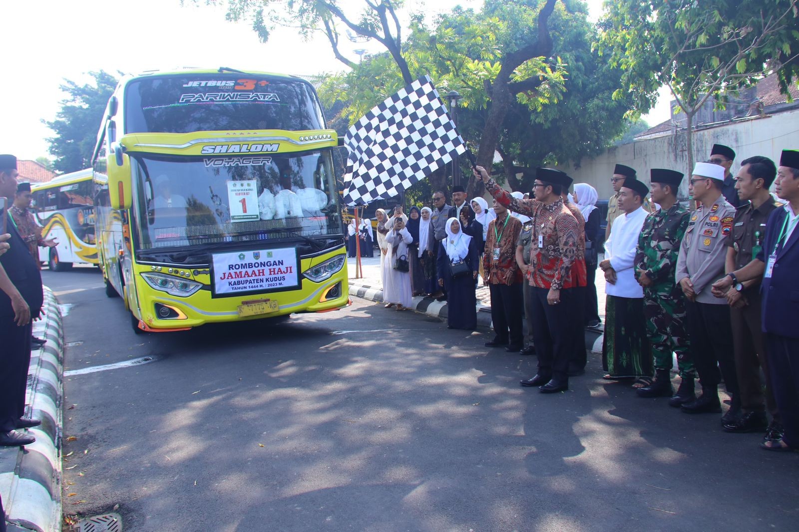 RILISJATENG.COM- Kumandang azan serta ikamah mengiringi pemberangkatan calon jemaah haji Kabupaten Kudus Tahun 2023. Dengan penuh haru, Bupati Kudus Hartopo melepas seluruh jemaah untuk diberangkatkan ke Asrama Haji Donohudan, Boyolali. Pelepasan tersebut juga dihadiri perwakilan unsur Forkopimda, Asisten Pemkesra, Kakan Kemenag Kudus, tokoh agama, dan undangan lainnya.