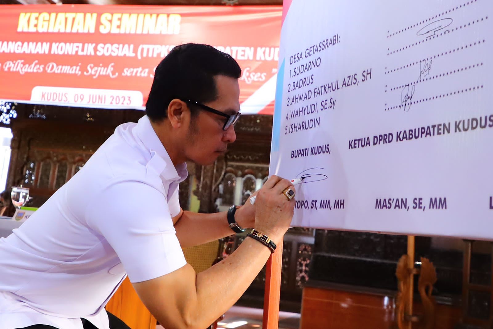 Dalam kesempatan itu, penandatanganan deklarasi damai calon kepala desa dan bakal calon kepala desa antarwaktu juga dilakukan. Bupati Kudus, Dandim 0722/Kudus Letkol Inf Andreas Yudhi Wibowo, perwakilan Forkopimda Kabupaten Kudus dan bakal calon kepala desa dari Desa Getassrabi, Desa Golantepus, serta Desa Janggalan turut menandatangani deklarasi. (RLS)