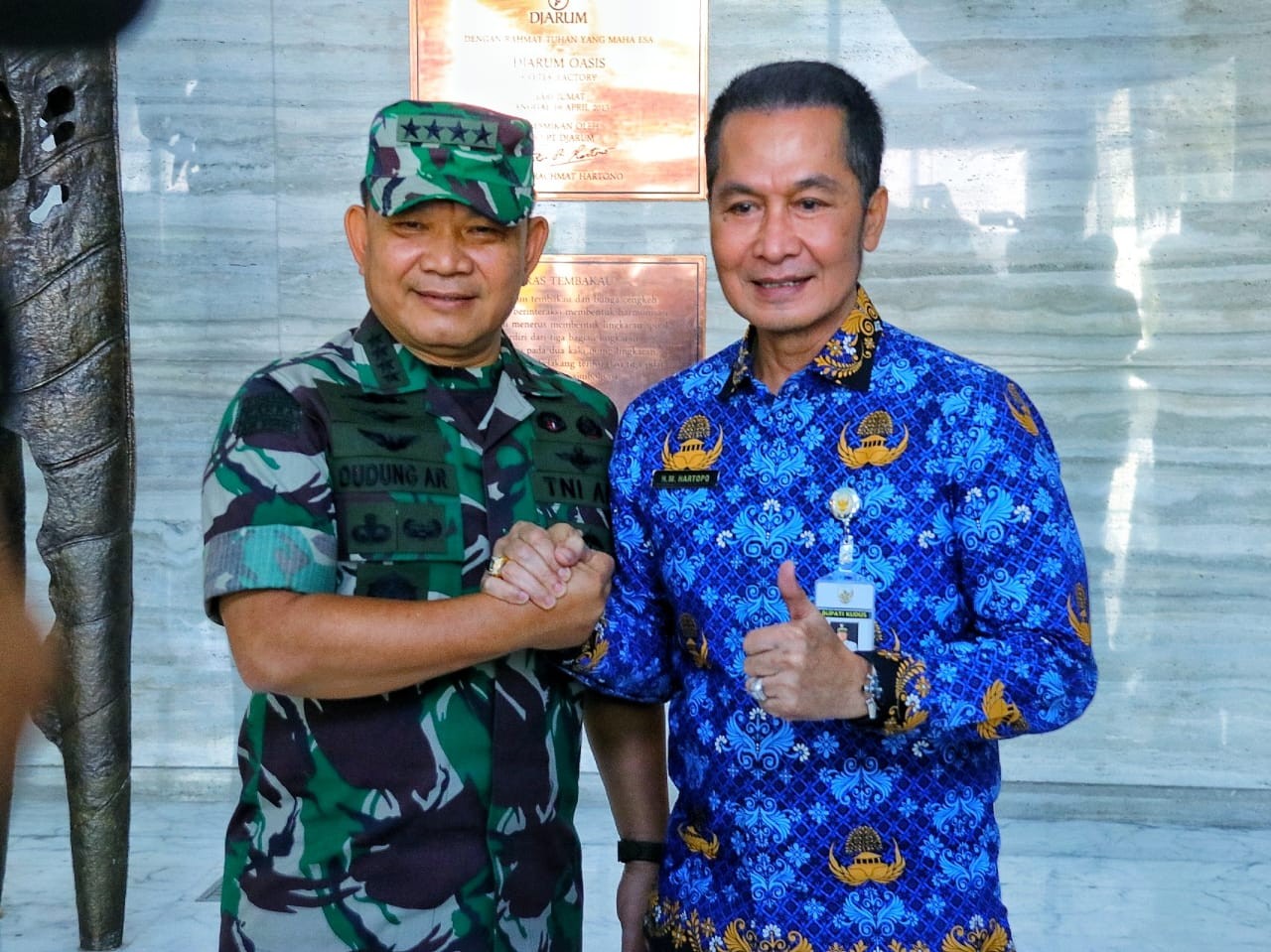 RILISJATENG.COM- Bupati Kudus HM. Hartopo bersama jajaran Forkopimda Kudus dan pihak dari PT. Djarum menyambut hangat kunjungan Kepala Staf TNI Angkatan Darat (KASAD) Jenderal TNI Dudung Abdurachman didampingi Ketua Umum Persit Kartika Chandra Kirana Ny. Rahma Dudung Abdurachman beserta rombongan di Oasis, Rabu (17/5).
